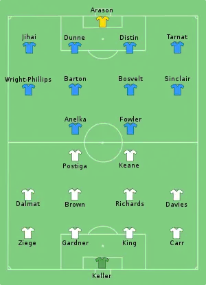 After the break, City appeared resurgent and scored within three minutes of the restart when defender Sylvain Distin headed in from a set piece.[13] Reserve goalkeeper Arason — who was playing his first game in English football and who manager Kevin Keegan had never even witnessed in full match conditions before — then drew plaudits for a double save following another Ziege free kick.[2] City reduced the lead to just one goal when Paul Bosvelt's half-volley took a deflection off Anthony Gardner in the 62nd minute.[1]