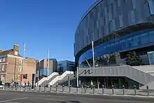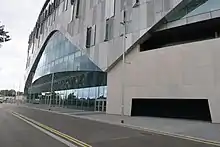 The stadium is intended to be active all year round as a sports and entertainment destination with conference and banqueting facilities. It offers visitor attractions such as a 'Dare Skywalk' opened on 31 August 2020; visitors may walk up the side of the stadium to the roof, then over a glass walkway around the golden cockerel above the South Stand where they may view the goal line from the roof, or abseil down to the south podium from a viewing deck.[178][179] The East Stand includes a double-height banquet hall that may be used for conference events.[120] To the south of the stadium, the raised podium forms a large open public square that may be used for a range of sporting and community activities. The Tottenham Experience, which includes a club shop, club archive and museum on Tottenham High Road, serves as the arrivals hub for visitors, where they may collect tickets and start a tour of the stadium. The museum is located in the Grade II listed Warmington House, and the new club shop is the largest in Europe, featuring a 100-seat auditorium area that may be used for pre-match experiences.[180] On the northwest corner is M cafe, a media room that may be open to the public and used as a cafe on non-match days.[181][182] On 23 July 2021, the OOF art gallery opened. The gallery occupies the Grade II listed Warmington House within the stadium and is accessed through the club shop.[183] Other facilities may be offered in ancillary buildings surrounding the stadium, including a ticket office, and a planned extreme sports building as well as a community health centre.[120]