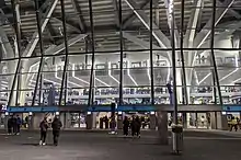 The roof is a cable net structure, held in place by an elliptically shaped compression ring.[82] The roof has a circumference of 720 metres, and it is clad in standing seam aluminium panels that end with extruded polycarbonate on the inside edge to allow light through onto the pitch but reduce the contrast of the shadow of the roof on the pitch.[121][88] 810 curved aluminium eave cassettes connect the roof to the wall. The pitch is lit by 324 LED floodlights, arranged in 54 groups of six and attached to the columns of the roofing system.[123] There are four large LED screens inside the stadium, the two on the south side are the largest of any stadium in Western Europe.[124] There are also two facade video displays on the outside of the stadium, three tiers of LED ribbon displays inside, and nearly 1,800 video screens in and around the stadium.[125][126][127]