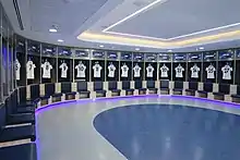 Away fans are allocated seats in the north east corner; 3,000 seats in the lower tier for Premier League games, while for domestic cups they may be allocated up to 15% of the capacity spread over three tiers.[143] The stands include areas with 7,500 seats that can be quickly turned into safe standing areas should there be a change in the legislation that banned standing in football stadiums.[145][146][147] It is the first Premier League stadium with areas of rail seating,[148][149] and it is one of the five stadiums to trial "safe standing" in January 2022.[150] A family area is located in the north west corner for those attending with their children. Disabled fans are catered for with 265 wheelchair bays, areas for assistance dogs as well as facilities for those with "complex care requirements".[137][151] Accessible seating is available in all four stands, where the design allows for flexible seating for family groups.[152]
