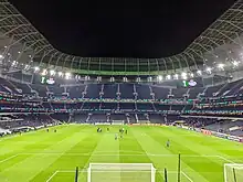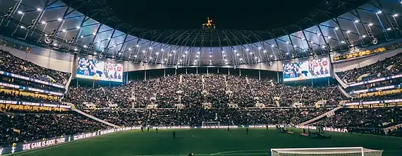 Tottenham Hotspur Stadium is the home of Premier League club Tottenham Hotspur in north London, replacing the club's previous ground, White Hart Lane. With a seating capacity of 62,850,[1] it is the 3rd largest football stadium in England and the largest club ground in London.[9] It is designed to be a multi-purpose stadium and is the home of the NFL in the UK. It features the world's first dividing, retractable football pitch, which reveals a synthetic turf field underneath for NFL London Games, concerts and other events.