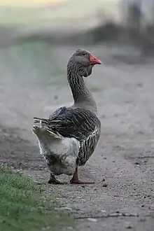 The Toulouse is a French breed of large domestic goose, originally from the area of Toulouse in south-western France. Two types are recognised: a heavy industrial type with dewlaps, the French: Oie de Toulouse à bavette;[7] and a slightly lighter agricultural type without dewlaps, the French: Oie de Toulouse sans bavette.[6] Both types are large, with weights of up to 9 kg.[11] Birds bred in the United Kingdom and United States exclusively for showing may be still larger, and have a somewhat different conformation.[12]: 378