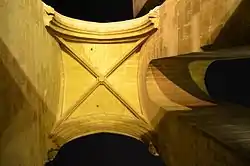 The sculpted vault at the top of spiral staircase was the work of Claus de Werve (1380-1439), the nephew and successor Claus Sluter, the court sculptor of the Dukes of Burgundy. De Werve was probably the sculptor of the other decorative works in the tower, the coats of arms of the Duke on the arches of the high chamber the carving of another emblem of the Duke, two tools, a level and a plane. The sculpted vault is considered one of the masterpieces of flamboyant gothic art. Werve's other notable work included the completion of the tomb of Philip the Bold at the ducal palace in Dijon, begun by Sluter, and the Virgin and the Child of Poligny, now in the Metropolitan Museum of Art in New York.[16][17]
