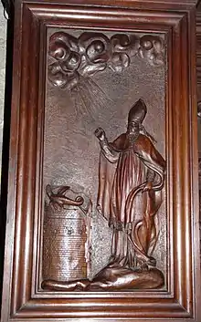 Saint Front confronting a dragon at the Tower of Vesunna (from a panel of the altarpiece at Saint-Etienne-de-la-Cité church).