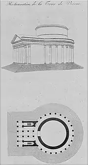 The round cella is all that remains of the temple, which gives it a height of approximately 24.46 meters (27 m when measured from the foundation). It has an external diameter of 19.6 meters. The wall has a thickness of 2.10 m at the base and 1.80 m from a visible recess of the base above the current floor. At this level, the inside diameter of the tower is 17.10 m. Originally, a wall surrounded a rectangular courtyard of more than one and a half hectares (141 m by 122) in which the fanum was centered, raised by a podium which was accessed through a rectangular pronaos with 6 columns.[2] The cella was surrounded by a 23-column peristyle.[8]