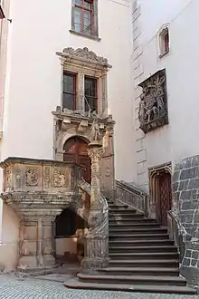 The Town Hall Staircase erected in 1537 by Wendel Roskopf is a masterpiece of the early Renaissance in Germany.[1]: 344 The curved staircase leads up to the portal of the courthouse wing and the pulpit, which was built at the same time. The latter rests on the side of the staircase on a pair of columns with a constricted shaft. The sculptor Andreas Walther I decorated the staircase with patterns unusual for that time. On of them shows Adam and Eve in the fall. Putti using the banister as a slide are found next to Siren that fill the decorative fields of the pulpit. The original reliefs were replaced by copies in 1950. They are now located inside the building, sheltered from erosion.