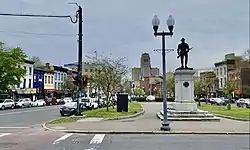 The SpanishAmerican War Monument is a 20-foot (6.1 m) tall monument of a bronze statue of a US soldier marching into battle, rifle leading the way.[4][5] It was sculpted by Dave Lithgow and erected in 1928. The statue commemorates the four companies of the First Provisional Regiment of the 10th Battalion which was located at the nearby Washington Avenue Armory. During the war they were sent to Hawaii due to concerns of an eminent Spanish attack, which never occurred.[4]