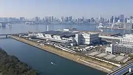 The Toyosu Market (豊洲市場, Toyosu Shijō) is a wholesale market in Tokyo, located in the Toyosu area of the Kōtō ward. There are two markets for seafood, one for general wholesale and one for bidding, and one market for fruits and vegetables, with each in its own building. Tourists can observe the auction market on a second floor viewing deck. There are restaurants with fresh seafood and produce from the market and shops (魚河岸横丁 uogashi yokocho). The market is built on reclaimed land in Tokyo Bay, and replaces the historic Tsukiji fish market, which now is a major tourist attraction.[1] Auction tours, events, merchandise sales and restaurants can be used by general consumers and tourists.[2] When it opened on 11 October 2018, it became the largest wholesale fish market in the world.[3]