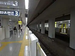 The subway station has two island platforms located on the third basement ("B3F") level, serving four tracks. Originally the two centre tracks were built since the opening and reserved for the future extension to Sumiyoshi,[1] on which were completed on 1 March 2013 for use by terminating services from Wakoshi from the start of the revised timetable on 16 March 2013.[2] Following the timetable revision on 15 October 2019 however, tracks 2 and 3 were temporarily shut down and subsequently covered up as a measure to alleviate congestion during the upcoming 2020 Tokyo Olympics, however it is not decided whether the tracks will be used again.[3][4]