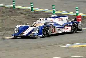 At Le Mans, the No. 8 Toyota qualified fourth, three-tenths ahead of the sister TS030 Hybrid in fifth, but off the pace of both Audi cars.[59] The race started on a damp and slippery track with the two TS030 cars driving faster than they had done in qualifying, moving up the field and separating the first five runners. As the track dried, Toyota dropped back from the quicker Audi cars, but had better fuel mileage. This recurring pattern continued into the night when the No. 7 and 8 Toyota vehicles took over second and third places after two of Audi's entrants ran into problems. Rain fell overnight and Toyota's tyre strategy enabled their cars to narrow Audi's lead to below two minutes. The positions remained constant until heavy rain fell on the track in the final hour, and Lapierre in the No. 8 Toyota aquaplaned into the barriers, requiring swift and extensive car repairs, and finished fourth overall. The No. 8 Toyota of Buemi gained on Kristensen's No. 2 Audi in the closing stages, but was too far behind to effect any positional change and came second.[60][61] Starting from the 6 Hours of São Paulo, Davidson, Buemi and Sarrazin took part in the next two races while Wurz and Lapierre focused on developing Toyota's 2014 car and Nakajima concentrated on a joint Super Formula and Super GT programme.[62]