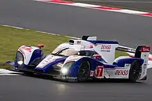 Nakajima missed the next two events because of Super GT commitments.[36][37] At the following round of the season, the 6 Hours of São Paulo, Wurz took the TS030 Hybrid's first pole position on his first timed lap which he improved on minutes later; he was nearly eight-tenths of a second faster than Audi's No. 2 car driven by Lucas di Grassi.[38] Wurz and Lapierre maintained the No. 7's pole position advantage throughout most of the race, only ceding it to Audi during the pit stop cycles, to secure its first victory in the WEC.[39][n 1] Lapierre qualified the No. 7 TS030 in third place for the 6 Hours of Bahrain behind the two rival Audi cars.[40] Wurz started the car and used slower traffic to move into the lead 13 minutes into the race. Wurz and later Lapierre cemented their advantage at the front of the field over the next two hours until both illuminated number panels failed, forcing an unscheduled seven-minute pit stop for replacement car parts.[41] Lapierre and later Wurz recovered to third place before Laiperre made contact with Jonny Kane in the No. 21 Strakka Racing HPD ARX-03a, damaging the No. 7 TS030 Hybrid's suspension. This caused him to abandon the car at the side of the track.[42]