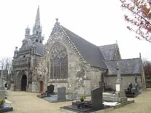 Trémaouézan Parish close (Enclos paroissial) is located at Trémaouézan in the arrondissement of Brest in Brittany in north-western France. The enclosure includes the Notre-Dame church, ossuary, and calvary. The church was built in the 15th Century and much enlarged in 1597 when the chapel was added. The Renaissance porch, located on the south side of the church, was added in 1610 with statues of the apostles. The calvary separates the church from the ossuary. Inside the church are a notable baptismal font and a number of wood carvings dating to the 17th century. The bell tower is of the "léonard" style. It was hit by lightning in 1702 but restored in 1714. There is a note in the church archives dated 1713, recording that many women sold their rings to help fund the reconstruction.[1][2] It is a listed historical monument.[3]