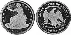 The bill provided, in part, for the striking of trade dollars which held legal tender status up to five dollars.[9] The legal tender provision was added by a last-minute rider at the behest of silver interests.[10] At the insistence of Ohio Senator John Sherman, the weight and fineness of the piece was indicated on the reverse, an attribution which numismatic historian Don Taxay found incomprehensible as "Chinese merchants would never understand them".[11]