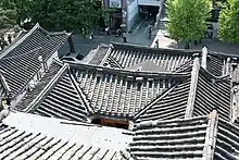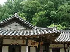 This is a kind of roof material used usually in mountain villages.[1] The oak bark is over 20 years old. At first, the oak bark is peeled at the time of Chuseo (one of the 24 seasonal divisions, about August 23). Next it is put into water. After that, it is dried and a heavy stone is placed on it to flatten it. Bark made this way is commonly about 1.3 meters wide. If the air gets dry, the bark shrinks and obtains many holes. However, if it rains or its humidity is increased, holes get smaller and smaller. At last they disappear quickly. The stone between the joint is not to blow the bark. The life of the oak bark is so long that there is a saying, "Giwa exists for ten thousand years, and the Oak Bark for one thousand years."