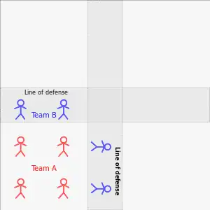 The game is played on a rectangular field, divided into four equal quadrants, by two teams of two to four players each.[117] The attacking team gathers in one quadrant, and the defending team gathers along the quadrant's borders with the adjoining quadrants. The objective of the attacking team is to enter the other quadrants without being touched by the players of the defending team. If all the members of the attacking team manage to enter all the quadrants, the attacking team wins, and its members shout "Bol Den Goivan Surr!".[118] In an Awadhi variation, they sing "Bol Goiyan Banva Surr" ("बोल गोइयां बणवा सुर्र");[117] if they are touched by the defending team, they lose, and have to stand on the quadrant line as "thieves", and have to sing another phrase.[119]