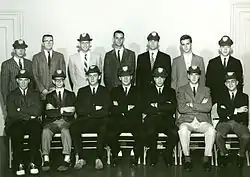 By the 1930s, the year's freshman rules began to be lifted by the beginning of Christmas break.[10] The "Vigilante Committee" was founded in 1941, serving as a grand jury for the Freshman Court.[10] During the 1940s, the Freshman Rules fell out of favor as returning World War II veterans refused to participate.[10] The rules were reinstated in the 1950s, once those students had graduated.[10] In 1956, the Student Council created "Lex Ultimo," a new organization to write and enforce the Freshman rules alongside the Freshman Court.[10] The 28 members of Lex Ultimo included 14 members of the Student Council and the 14 Freshman Court Judges, all of whom wore a uniform of red hats with a white shield and a gavel and paddle.[10] Lex Ultimo drafted the year's rules at the first meeting of the year, known as the "blood meeting."[10] The organization was also responsible for freshman of freshman orientation, pep rallies, freshman cheering sections, and the annual pushball contests.[10]