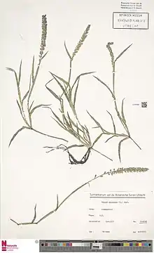 Tragus racemosus, commonly referred to as stalked bur grass,[1] European bur grass,[2] or large carrot seed grass,[3] is a species of grass native to Europe.[4] It is often confused with a similar plant of the same genus, Tragus berteronianus.[5] It is a monocot and is considered a weed in many countries and is a relatively uncommon seed contaminant.[2]