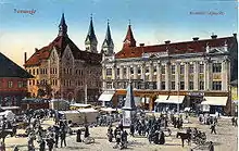 Until late 18th century, Trajan Square had fronts made up of isolated houses with only a ground floor, with a rural aspect, probably many of these houses being made of beaten clay.[2] It was not until the 19th century that continuous fronts were built both in the square and along the adjacent streets. One-storey buildings also appeared in the 19th century; Trajan Square thus acquires an urban character. If during mid-19th century there were only houses with a ground floor or one floor, towards the end of the century there were also two-storey houses. Around the 1900s, the buildings that dominate the square today are built: the House of the Serbian Community (built in 1895), the House of Countess Mirbach (built in 1905), the Mercury House (also known as Béla Fiatska House, built in 1909) and the Municipality Tenement House (named after 1918 Ștefania Palace, built in 1910).[2] From an architectural point of view, the House of the Serbian Community belongs to the eclectic/historicist style typical for the second half of the 19th century, and all the other buildings to different currents of the Art Nouveau style.[2] Two public monuments are also located in Trajan Square: the obelisk or pyramid with a cross, erected in 1774 by the Timișoara high official Stojša Spasojević, and the stone bell, the work of the sculptor Ștefan Călărășanu, erected in honor of the 1989 Revolution.[3]