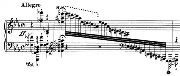 The main theme, beginning on measure 20, makes use of the sostenuto pedal. It requires precise coordination to only sustain the fanfare-like melody, with the pizzicato accompaniment in the background.