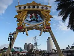 Since Treasure Island Shopping Center is located around the Port of Kaohsiung, the mall takes the ships sailing the sea as the overall design image: empty ground squares, parking lots are like the endless sea, and the sea is dotted with giant lighthouses and pirate ships. The entire mall can also be regarded as a giant ship. The ground floor is a vast ship deck. Through the central sunken starlight stage and the multiple entrances and exits around it, the ground floor deck and the business space of the basement cabin are connected.[3]
