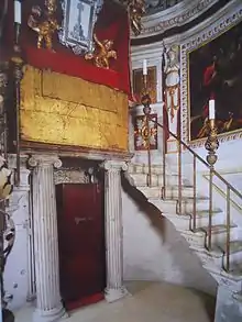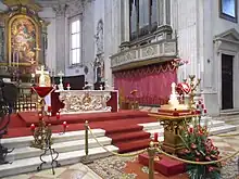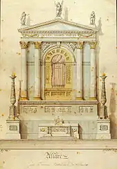 The first proposal, made by Rodolfo Vantini by means of a project, to erect a new, majestic altar in the New Cathedral to which the entire treasure would be transferred dates back to 1829.[34] The altar would be built on the north wall of the transept, mirroring that of the Blessed Sacrament by Vantini himself, which had just been completed.[35] The proposal, though not evident from the documents, must have found a wide following right away:[36] in 1845 two cipollino columns were purchased due to market opportunity "so that they might not be otherwise lost, and in the purpose that they might be employed, whenever that might be, in the altar to be erected in the new cathedral."[37] Other projects, in the same year, were presented by the National Academy of St. Luke in Rome and by the Brescian architect Gaetano Clerici, both of which, however, were considered to be in disharmony with the already present altar of the Blessed Sacrament.[36][38] In the years immediately following, the heated debate over the new altar continued with the continuous presentation of plans and consultations with schools and institutions, including the Brera Academy.[38] However, as early as 1849, it was the president of the Company of Custodians, Antonio Valotti, who dropped the whole issue, as recorded in a letter between him and Clerici, postponing it "to better times"[37] given the turbulent political situation of the Italian wars of independence.[38]