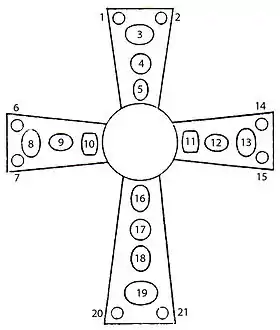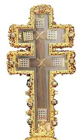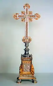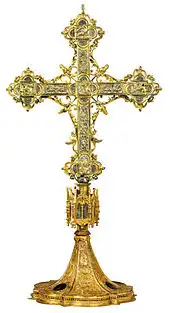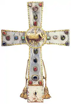 The Cross of the Field, also known as the Cross of the Oriflamme, is a Greek cross with arms slightly expanded at the ends, with an extension on the lower arm making it a Latin cross. It is 42 centimeters high, 28.5 centimeters wide and 5 centimeters thick, consisting of a walnut wood core entirely covered with pure silver foil with gilded silver edges attached by pegs.[8] On one side the arms are connected by a disk, on the other by short diagonal strokes. The whole is adorned with set gems and figures worked in high relief in the silver foil.