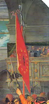 In 1764 Count Bartolomeo Martinengo, president of the Company of the Custodians of the Holy Crosses, had an exact copy of the Cross of the Field made to be used as a processional cross for the regular processions organized by the company, thus avoiding the need to take out the real cross on each occasion.[29] A reproduction of the banner of the Oriflamme, also believed by Valentini to be a copy of the lost original, was added to the new cross.[30]