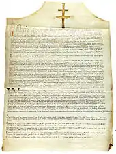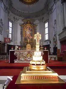 The best-known legend explaining the origin of the treasure is the one first narrated by Jacopo Malvezzi in the first half of the fifteenth century: the historian recounts that in the early ninth century, during the transfer of the relics of Saints Faustinus and Jovita from the basilica of San Faustino ad Sanguinem (since 1956 renamed to the church of Sant'Angela Merici),[4] the remains of the two patron saints, during a stop next to Porta Bruciata, would exude blood. Duke Naimon of Bavaria, governor of Brescia, who happened to be in the procession, witnessing the miracle immediately and publicly converted to Catholicism, immediately donating the Illustrious Relic, the Cross of the Field and the banner of the Oriflamme to the abbot of the monastery of Saints Faustinus and Jovita and entering the monastery himself as a monk. Duke Naimon, moreover, was not the first owner of the relic but, again according to the account, had received it as a gift directly from Charlemagne. Towards the end of the 11th century, after an attempted theft, the two crosses were reportedly transferred to the Old Cathedral for better and safer storage.[5][6][7]