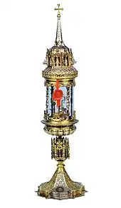 The first known piece of the treasure to be added to the three originals (Cross of the Field, Illustrious Relic and staurotheke) is the small chest made in the first half of the fifteenth century to contain some secondary objects, almost all of which have been lost.[22] The great new arrival, however, occurs in the second half of the century: on August 12, 1474, the Special Council of the city and the General Council on the 30th of the same month commissioned goldsmith Bernardino delle Croci to make a new reliquary for the fragment of the cross, similar to the one the artist was already assembling for the convent of San Domenico (lost), to be delivered by May 1475, that is, the following year.[22][23][24]
