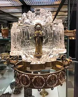Reliquaries and precious objects used for the liturgical functions in St Mark's Basilica were initially kept in various locations within the church.[3] The creation of the treasury seems to date to the early thirteenth century when many objects were plundered by the Venetians from the churches, monasteries, and palaces of Constantinople during the sack of the city (1204) in the Fourth Crusade and sent to Venice as spoils of war by Doge Enrico Dandolo who led the Venetian forces. These objects were largely destroyed in a fire in 1231: only a fragment of the True Cross, an ampulla containing the Precious Blood of Christ, and a relic of Saint John the Baptist survived.[4] However, an inventory of 1283 shows that the treasury had been recreated by that time. The new collection included works of art brought back to Venice by the Venetians in 1261 when they were expelled from Constantinople as well as gifts from foreign rulers and objects produced locally. Over time, the collection also included precious objects that had originally been deposited as security for loans from the government and then kept as a result of default, as well as items deposited for safety by private individuals and then unclaimed.[5]
