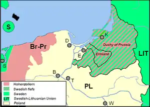 Hard-pressed himself by several countries entering the war against him, Charles X Gustav in January 1656 agreed with Frederick William I on the Treaty of Labiau, which altered the terms of Königsberg in a way that the Hohenzollern electors were freed of Swedish vassalage for the Prussian duchy at the cost of Ermland and a more active participation in the war.[12] In the subsequent treaties of Wehlau and Bromberg, John II Casimir confirmed Frederick William I's sovereignty in Prussia after the latter abandoned Sweden in the war.[13]