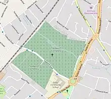 The cemetery is located in Tredworth Road and Cemetery Road and occupies 35 acres.[1] The Sudbrook crosses the northern part of the area.