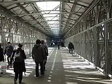 With the destruction of the North Bridge and the closure of the South Bridge due to the terrorist attacks, Battery Park City residents sought for safe passage across West Street in the immediate months following September 11, 2001. The Rector Street Bridge (40°42.45′N 74°0.915′W / 40.70750°N 74.015250°W) was seen as a temporary solution.[19] The bridge was designed by SHoP Architects and opened in August 2002. The bridge has a span of 230 feet (70 m), with a 170 feet (52 m) ramp on the western end of the bridge. Much of the bridge was built from pre-fabricated materials, the design of the bridge was a steel box truss system.[20] The panels surrounding the bridge allow natural light to flow through, but it limits the view to disallow people from using it to view the World Trade Center site.[21] In 2006, the New York State Department of Transportation released its proposal to reconstruct West Street into a promenade. The plans did not feature a permanent replacement, suggesting that the first Rector Street Bridge may be permanent. However a renovation was planned then, to keep the bridge in place for another ten years.[19]