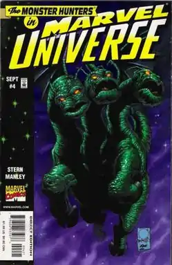 A Skrull named De'Lila arrived looking for the Inorganic Technodrome and took over Tricephalous and the other monsters causing them to go on a rampage.[3] When De'Lila was defeated, Tricephalous and the other monsters returned to Monster Island with the Punisher on their trail. When the Punisher planned to destroy the entrance to Monster Island, he changed his mind when he noticed the Fantastic Four.[4]