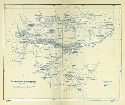 The Trichinopoly district was a district of the erstwhile Madras Presidency of British India. It covered the present-day districts of Tiruchirappalli, Karur, Ariyalur and Perambalur in the Indian state of Tamil Nadu. The administrative headquarters was the town of Trichinopoly, Trichy or Tiruchi, now known as Tiruchirappalli. The district covered an area of 2,632 square miles (6,820 km2) in 1907. It was bound by the districts of South Arcot to the north, Salem to the west, Coimbatore to the west and north-west, Tanjore to the east and Madurai to the south. The princely state of Pudukkottai remained within the jurisdiction of Trichinopoly district from 1865 to 1947.