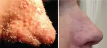 The nose of a patient diagnosed with trichodysplasia spinulosa. Left panel shows characteristic findings of facial papules, protrusive keratotic spicules, and thickened skin; right panel shows appearance following treatment with topical cidofovir.[1]