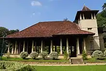 The Trinity College Chapel ("Holy Trinity Church") in Kandy, Sri Lanka is one of the more distinctive church buildings in Sri Lanka. It is situated below the Principal's bungalow at Trinity College, Kandy. The chapel is one of the first and finest examples of the application of indigenous architecture in the design of an Anglican church in the country.[1] The building is modelled on traditional Buddhist architecture,[2][3] reminiscent of those found in Polonnaruwa, an ancient capital of Sri Lanka, in that it is an open building with a lofty hipped roof supported by numerous carved stone pillars.[4]