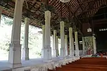 At the time when most Europeans were content to build churches in their own Gothic style, Gaster deliberately sought inspiration from the local Sinhalese architecture. Prototypes for the Church are to be found at the Royal Audience Hall, Magul Maduwa (Celebration Hall), of the Kingdom of Kandy[12] (built in 1783 by Sri Rajadhi Rajasinha) and the 14th century Embekka Devalaya Shrine near Kandy.[13] The first example of the use of traditional architectural design in Christian churches, also involved both Rev. Fraser and Rev. Gaster was the chapel at the Peradeniya Training Colony,[14] however similar to the Magul Maduwa and the Embekka Shrine the pillars of this chapel are made of wood.