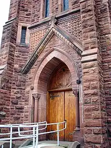 Trinity Episcopal Church is a historic Episcopal church located at Potsdam in St. Lawrence County, New York. It was built in 1835 in the Federal style with Gothic elements built of red Potsdam Sandstone. It was greatly enlarged and transformed into High Victorian Gothic style later in the 19th century, with less significant alterations continuing into the 20th century. The front facade of the church took its final form in 1886 and is a lavishly decorated Victorian Gothic creation, made possible by donations from Thomas S. Clarkson and his family.[2] It features a 110-foot-tall (34 m), 19-by-19-foot (5.8 by 5.8 m) four-level tower. Also on the property is a stone wall dating to 1870, a large cast iron urn dating to about 1880 and a cast iron lamppost on a sandstone base dating to 1880.[3]
