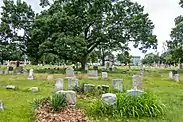 Grace Church cemetery is a triangular parcel of land located at the intersection of Broad Street and Elmwood Avenue.[3] The church purchased four acres here in 1834, and doubled its size in 1843.[3] A caretaker's cottage was built 1859-1860 in the Gothic Revival style.[3] The cottage, part of the Providence Landmark District, was restored several times: in 1982, 2008, and again in 2010.[3] The cemetery is a frequent target of vandalism, with many toppled and broken gravestones.[3] The Cemetery was listed as one of Rhode Island's "most endangered properties" by the Providence Preservation Society for several years.[4][3]
