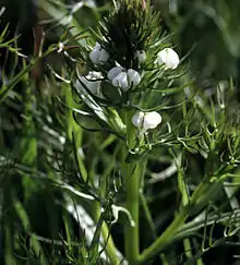 The inflorescence is a dense spike of flowers. Each flower has a white corolla 1 or 2 centimeters long with a beaklike, yellow-tinged upper lip and a wider lower lip which is divided into three pouches. The lower lip may have purple spots underneath.
