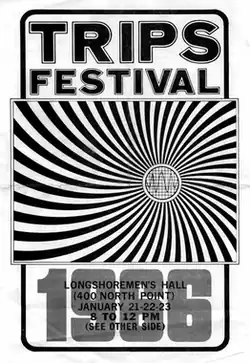 Organized by Stewart Brand, Ken Kesey, Owsley Stanley, Zach Stewart and others,[30][31][32][33] ten thousand people attended this sold-out event, with a thousand more turned away each night.[34] On Saturday January 22, the Grateful Dead and Big Brother and the Holding Company came on stage, and 6,000 people arrived to drink punch spiked with LSD and to witness one of the first fully developed light shows of the era.[35]