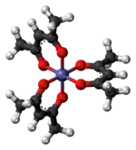Fe(acac)3 is an octahedral complex with six equivalent Fe-O bonds with bond distances of about 2.00 Å. The regular geometry is consistent with a high-spin Fe3+ core. As the metal orbitals are all evenly occupied the complex is not subject to Jahn-Teller distortions and thus adopts a D3 molecular symmetry. In contrast, the related metal acetylacetonate Mn(acac)3 adopts a more distorted octahedral structure.[3] The 5 unpaired d-electrons also result in the complex being paramagnetic, with a magnetic moment of 5.90 μB.