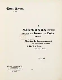 Trois morceaux en forme de poire (Three Pieces in the Shape of a Pear) is a 1903 suite for piano four hands by French composer Erik Satie. A lyrical compendium of his early music, it is one of Satie's most famous compositions, second in popular recognition only to the Gymnopédies (1888).[1] The score was not published until 1911. In performance it lasts around 14 minutes.