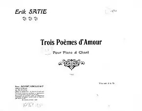 The Trois poèmes d'amour (Three Love Poems) is a 1914 song cycle for voice and piano by Erik Satie. It is the only set of mélodies (French art songs) Satie composed to his own texts.[1] In performance the set lasts between 2 and 3 minutes.