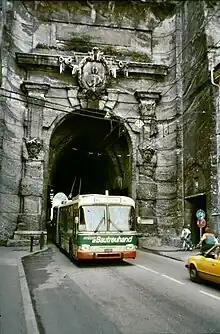 The oldest operable trolleybus in Salzburg is a 1957 model ÜHIIIs. This is not an original Salzburg vehicle; with the fictitious number 123, it comes from the Solingen trolleybus system (former number 40) and has been loaned by an English collector.