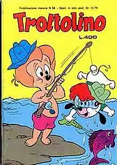 Trottolino was created in 1952 by Giorgio Rebuffi under the pen name "O'Layne" and was the title character of a comics magazine published between 1952 and 1990. It was the first comics magazine published by Renato Bianconi, a former collaborator of publisher Alpe; released without any marketing hype, it got an immediate commercial success and launched the career of Bianconi as a publisher.[1]