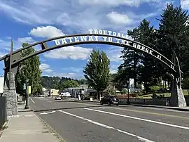 The Troutdale Centennial Arch is a 60-foot (18 m) arch spanning the Historic Columbia River Highway in Troutdale, Oregon, United States.[1][2] The arch rests on piers created by Michael Byrne and has bronze sculptures of salmon by Rip Caswell.[3]