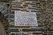 The Truce of Malestroit was signed on 19 January 1343 between Edward III of England and Philip VI of France, in the chapelle de la Madeleine in Malestroit. After the signing of this truce, the English sovereign and his troops left Bretagne for England.