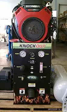 A truckmount carpet cleaner is a carpet and upholstery cleaning unit that is generally mounted to the floor of a van or trailer.[1] Its cleaning method is hot water extraction. The operator would park the van near the premises, connect the vacuum hose and solution line hose into the machine, bring the hoses into the building, and connect a carpet cleaning wand to the end of the hoses.